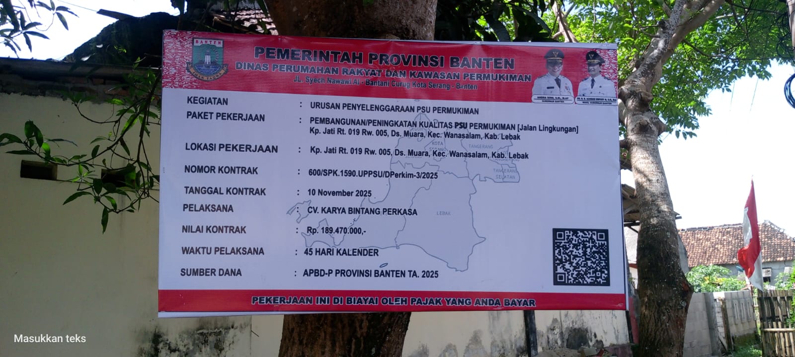 Proyek tersebut tercatat dalam Nomor Kontrak: 600/SPK.1590.UPPSU./DPERKIM-3/2025, tanggal kontrak 10 November 2025, dilaksanakan oleh SV. Kariya Bintang Perkasa, dengan nilai anggaran Rp 1.89.470.000. Anggaran bersumber dari APBD-P Provinsi Banten Tahun Anggaran 2025, dengan waktu pelaksanaan 45 hari kalender.