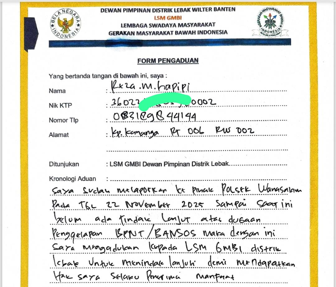 jejakkasuspaltv.com | Lebak – 02 April 2026 — Dugaan penggelapan bantuan sosial kembali mencuat di Kabupaten Lebak. Kali ini terjadi di Kecamatan Wanasalam, di mana LSM GMBI Distrik Lebak menerima pengaduan resmi dari ahli waris terkait bantuan Program Keluarga Harapan (PKH) dan Bantuan Pangan Non Tunai (BPNT) yang diduga tidak pernah diterima, meskipun tercatat aktif dan telah dicairkan.