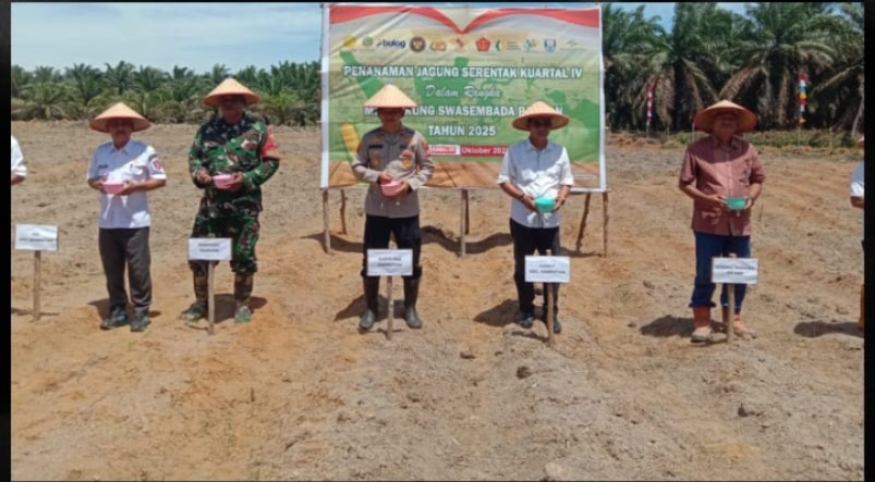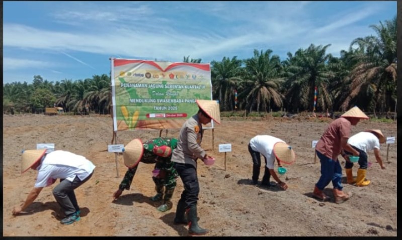 jejakkasuspaltv.com | Banyuasin – Guna mendukung program ketahanan pangan pemerintah, Kapolsek Rambutan, Iptu Harmoko, S.H., M.H., memimpin langsung kegiatan penanaman jagung kuartal IV di lahan PT. Patri Agung Perdana, Rabu (29/10/2025). Kegiatan kolaboratif ini melibatkan unsur Kementerian, Gabungan Pengusaha Kelapa Sawit Indonesia (GAPKI), Perhutani, swasta, serta kelompok petani swadaya.