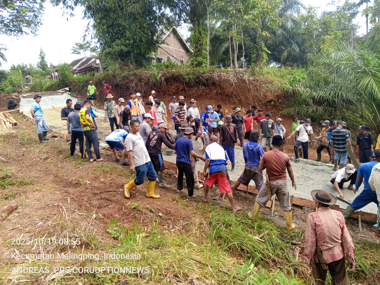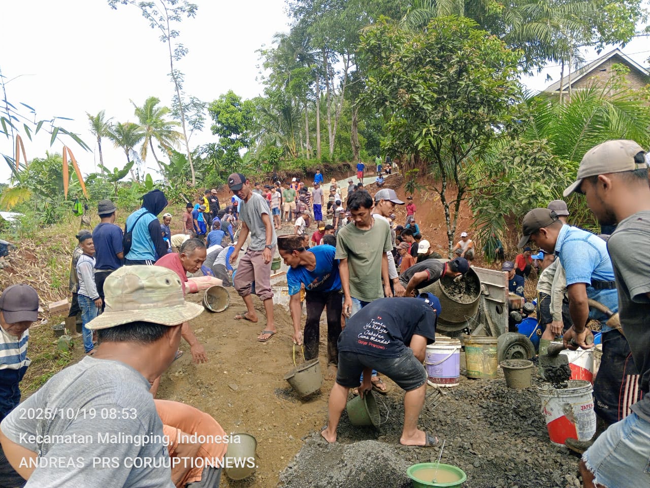Jejakkasuspaltv.com | Lebak – Warga Kampung Sindangbarang di Desa Sangiang, Kecamatan Malingping, Kabupaten Lebak, Provinsi Banten, menunjukkan contoh nyata semangat gotong royong dalam membangun infrastruktur desa. Dengan penuh semangat dan kebersamaan, masyarakat secara swadaya melakukan pembangunan jalan di kawasan perbatasan antara Desa Sumberwaras dan Desa Bolang, yang selama ini terabaikan oleh pemerintahan desa, Minggu, 19 Oktober 2025.
